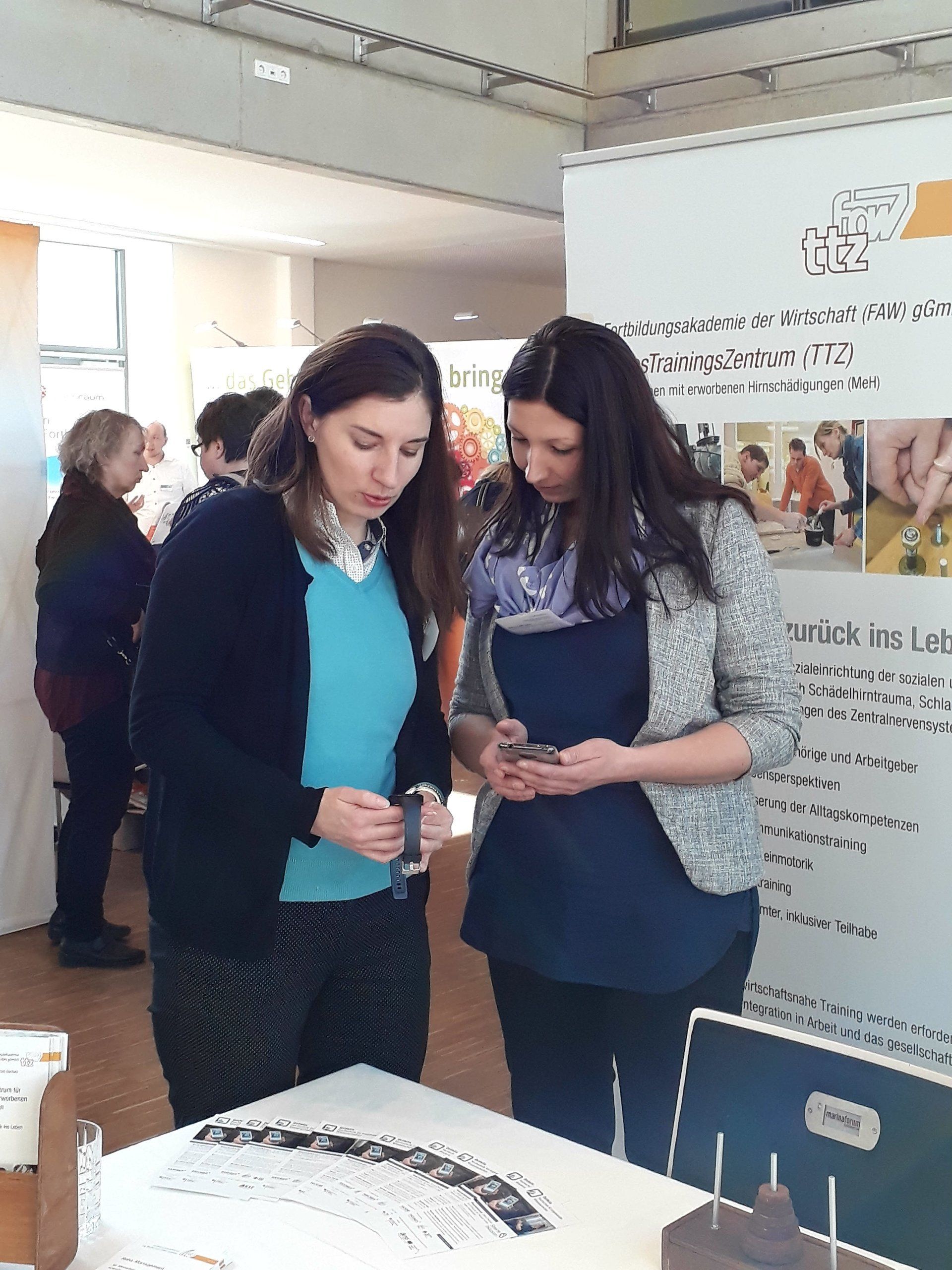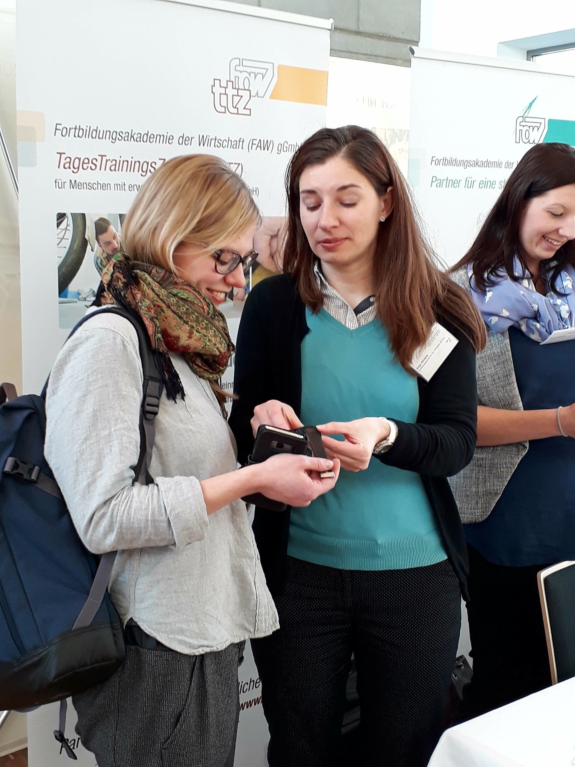 In einem Workshop zeigten auch die Praxispartner – DRK-inkluzivo und Fortbildungsakademie der Wirtschaft (FAW) – den Einsatz der RehaGoal-App mit Smartphones oder -Watches im beruflichen Alltag. „Unsere Zielgruppe hat oftmals Schwierigkeiten in der Handlungsplanung. Es fällt ihnen schwer, sich Arbeitsschritte und deren Reihenfolge zu merken“, erklärt Jelena Huisikveld, Therapeutin bei der FAW.